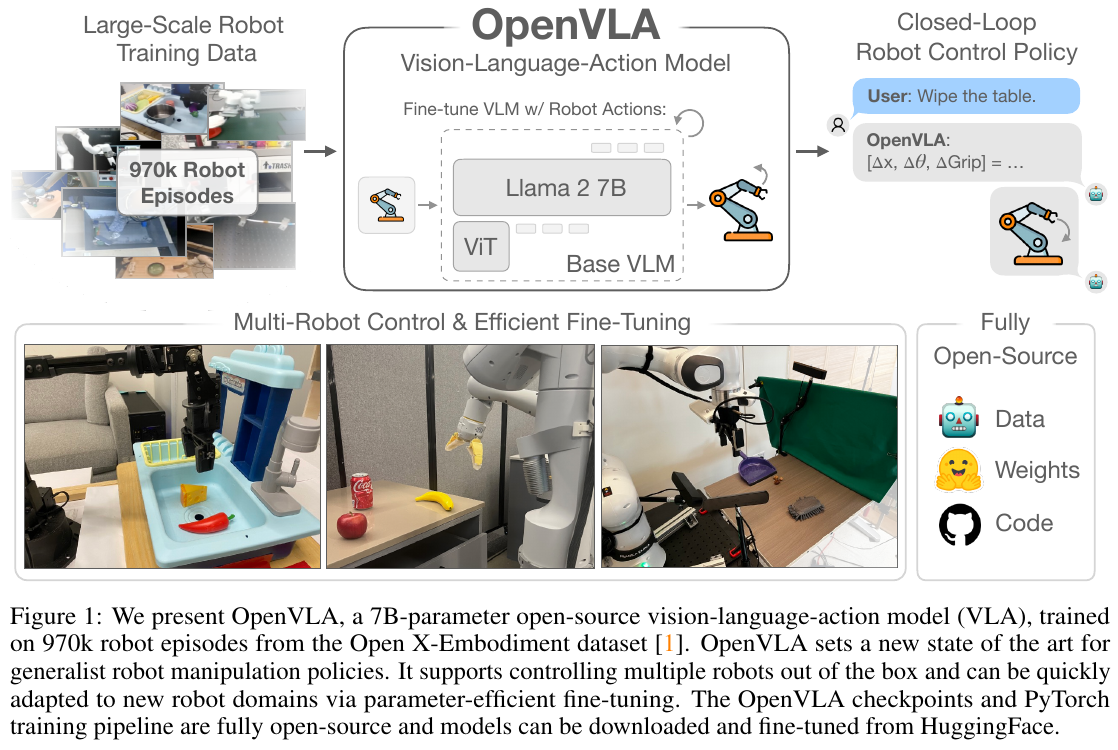 - 2024年6月:斯坦福大学发布 OpenVLA(7B参数),首个开源大规模VLA标杆,在多项任务上超越RT-2。