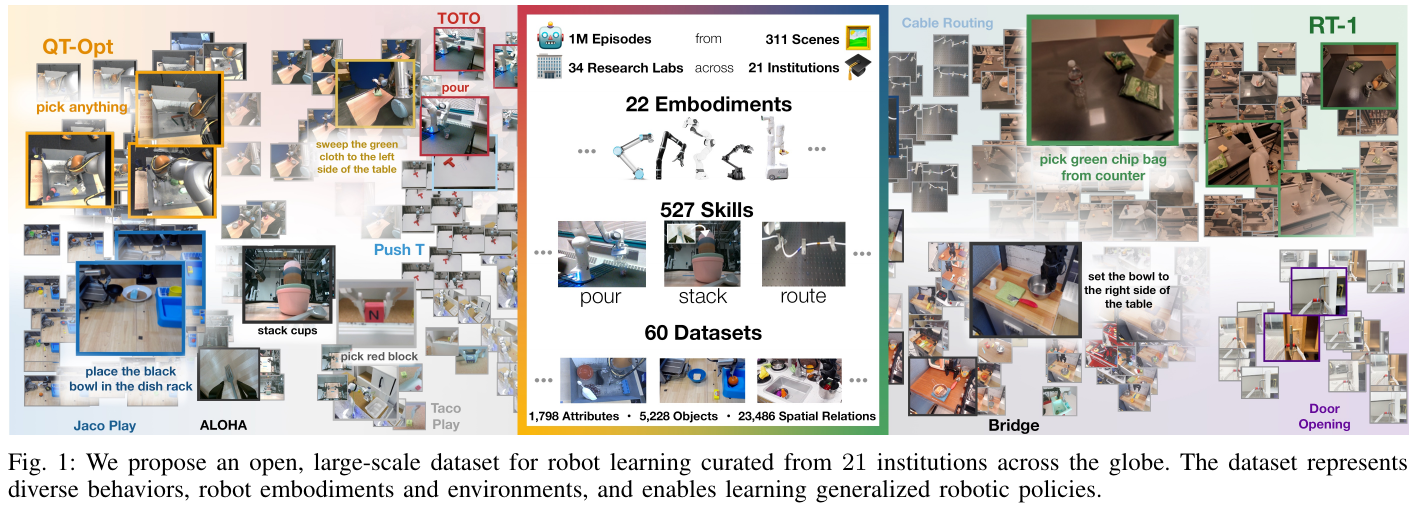 - 2023年10月:Open X-Embodiment (OXE) 数据集发布(970k轨迹,22种机器人),定义了机器人数据标准格式 RLDS。