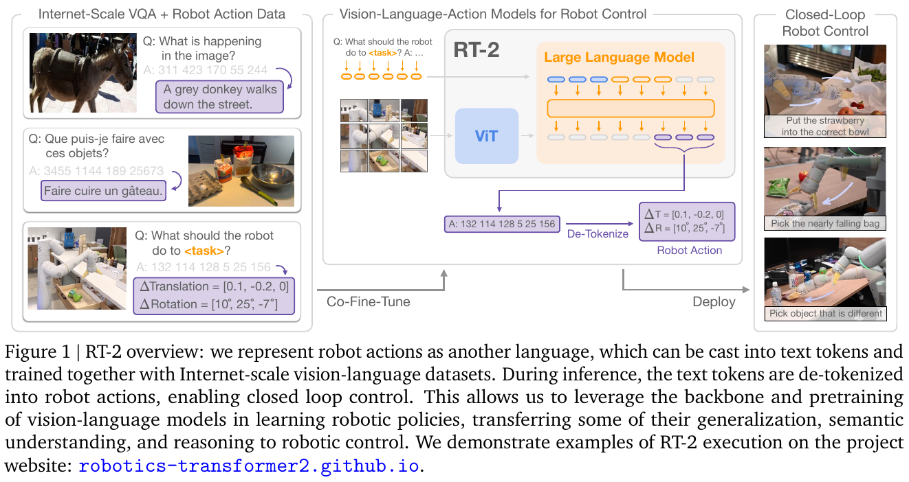 - 2023年7月:Google DeepMind发布RT-2,首次将VLM成功转化为VLA模型,正式开创VLA研究方向。