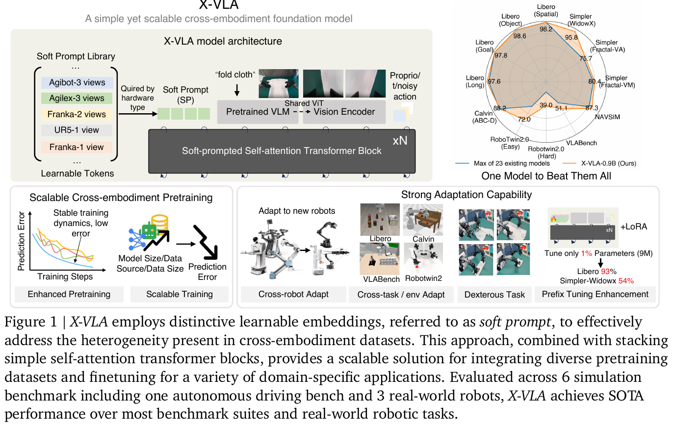 X-VLA 是由清华 AIR 和上海 AI 实验室联合推出的彻底开源项目。其核心贡献在于通过 Soft Prompting(软提示) 技术解决了“一个大脑控制所有机器人”的难题。相比于传统的对每种硬件进行微调,X-VLA 仅需学习极小规模的机器人特定 Prompt,即可将通用的物理规律迁移到不同的机械臂和人形机器人上。该项目从代码、数据、权重到评估基准全量公开,是学术界最彻底的开源范本。